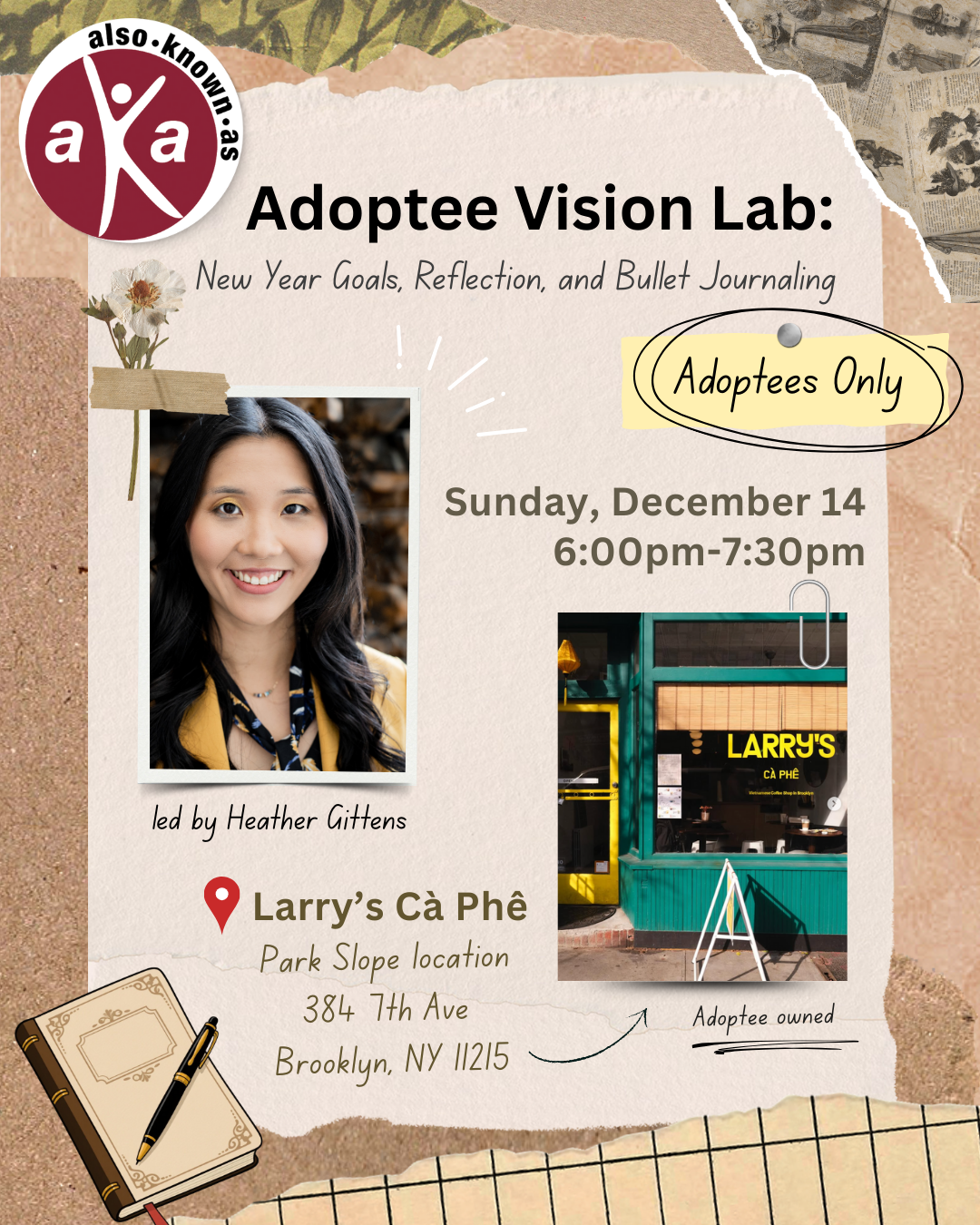 Adoptee Vision Lab is an intimate journaling and vision-boarding workshop where we explore identity, belonging, and future dreams through art and reflection. Together, we’ll pause, breathe, and map out how far we’ve come and what we hope to cultivate in the year ahead—whether it’s healing, connection, clarity, or courage. 🌱 💛